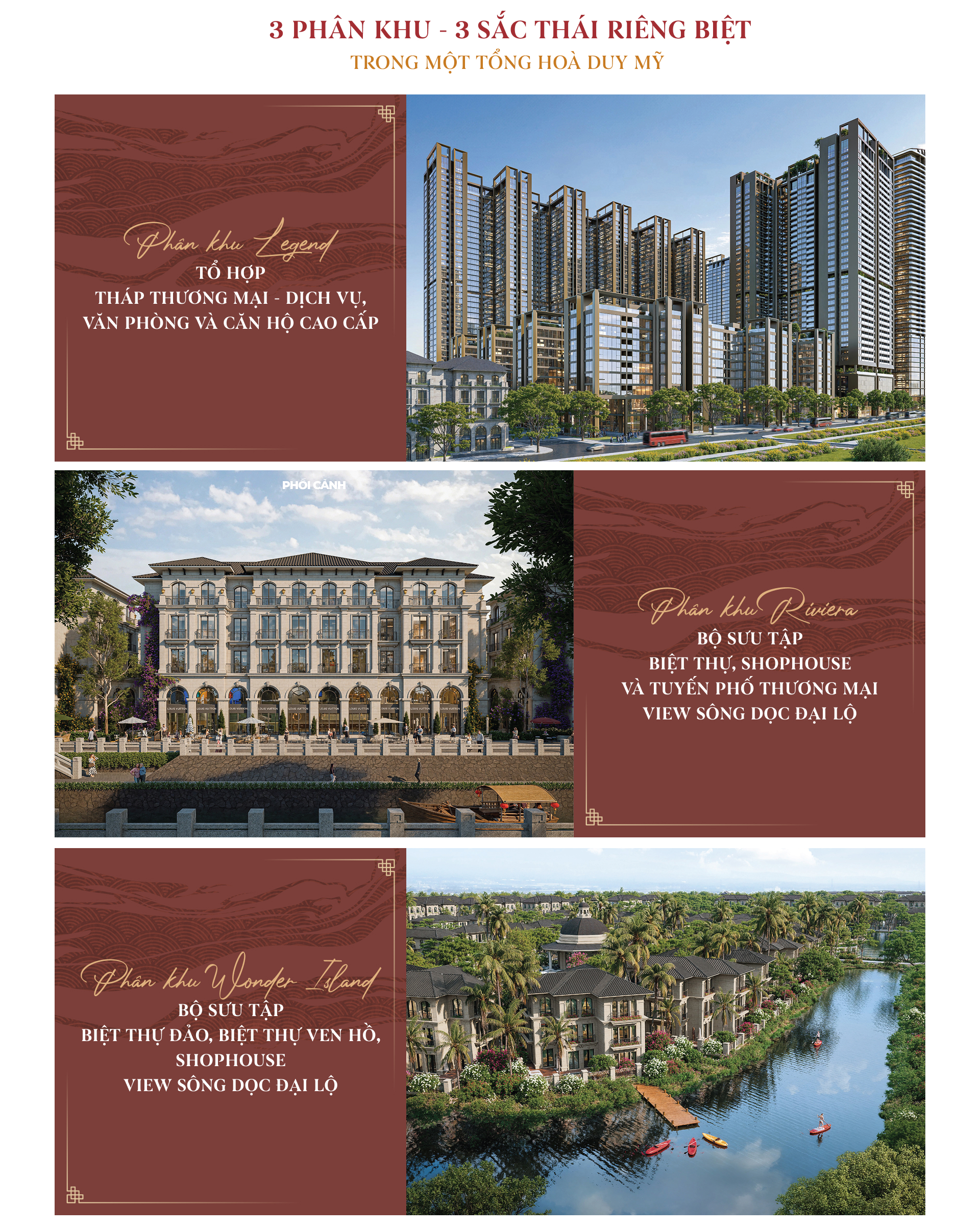Dự án được quy hoạch trên tổng diện tích gần 54 ha, chia thành 3 phân khu với những dấu ấn riêng biệt, kết hợp hài hòa giữa kiến trúc Á Đông và nét cổ điển phương Tây