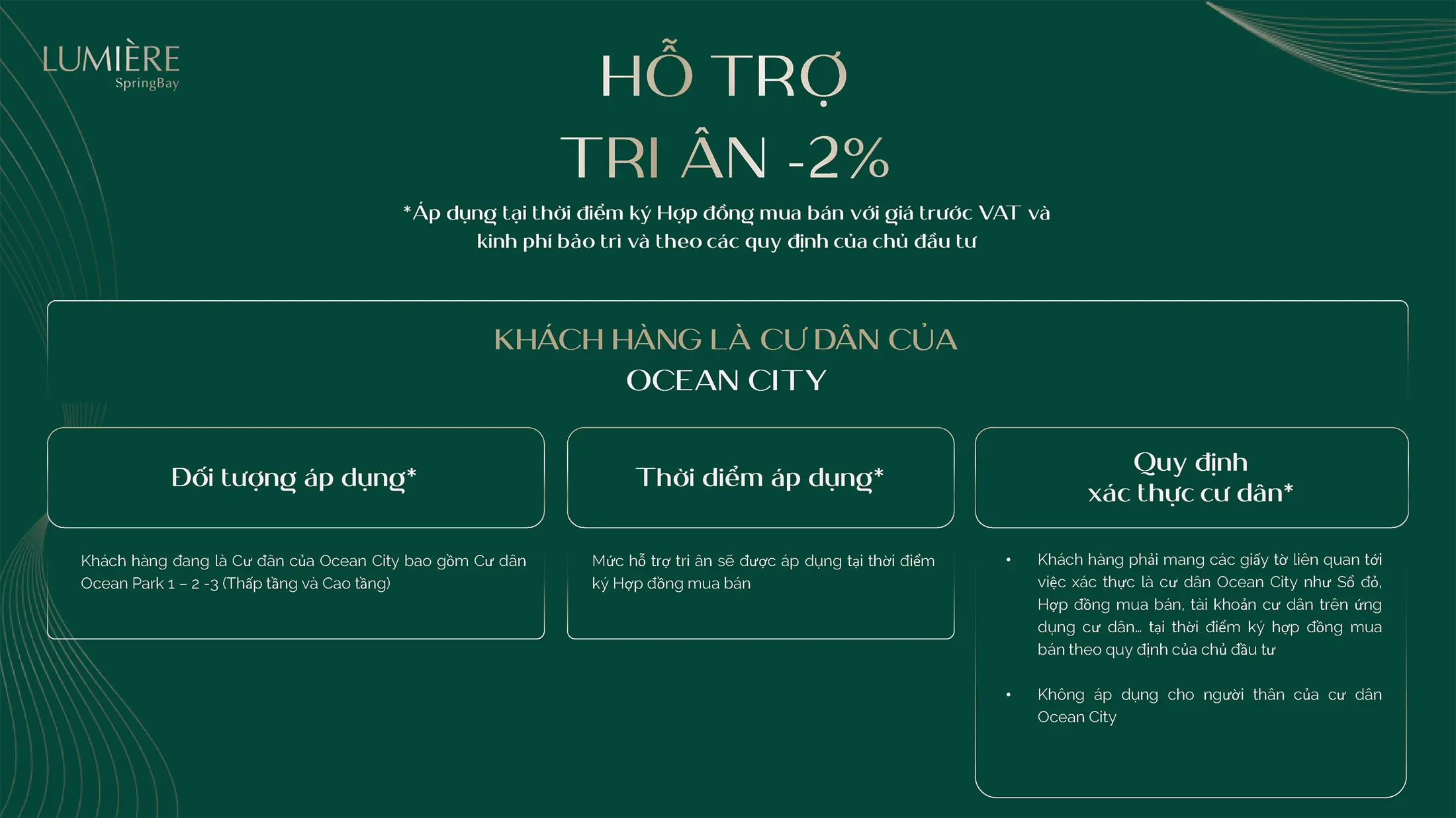 LUMIÈRE SpringBay không chỉ là một ngôi nhà, đó là một tuyên ngôn về phong cách sống, một khoản đầu tư thông thái và một di sản vô giá cho tương lai. Giai đoạn 1 luôn là thời điểm có mức giá tốt nhất và nhiều ưu đãi độc quyền nhất.